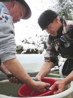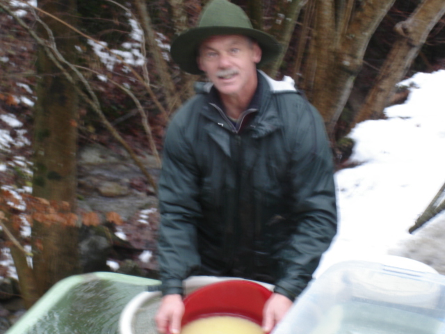 unser Freund und Fischerkollege Marcel Keller (links)und Tobias Stocker (rechts) im Einsatz für den Kt. Schwyz um den Bachforellen Nachwuchs zu gewährleisten.